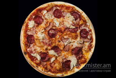 Томатний соус, моцарела, салямі, бекон, шинка, куряче філе.