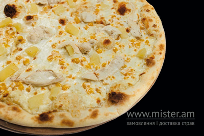 Вершки, моцарела, куряче філе, ананас, кукурудза.