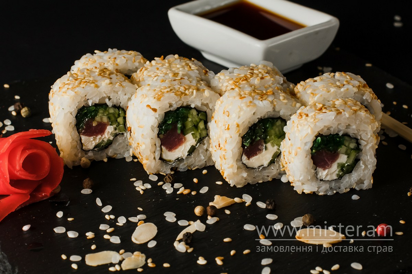 Рис, огірок, хіяши, кунжут, сир вершковий.