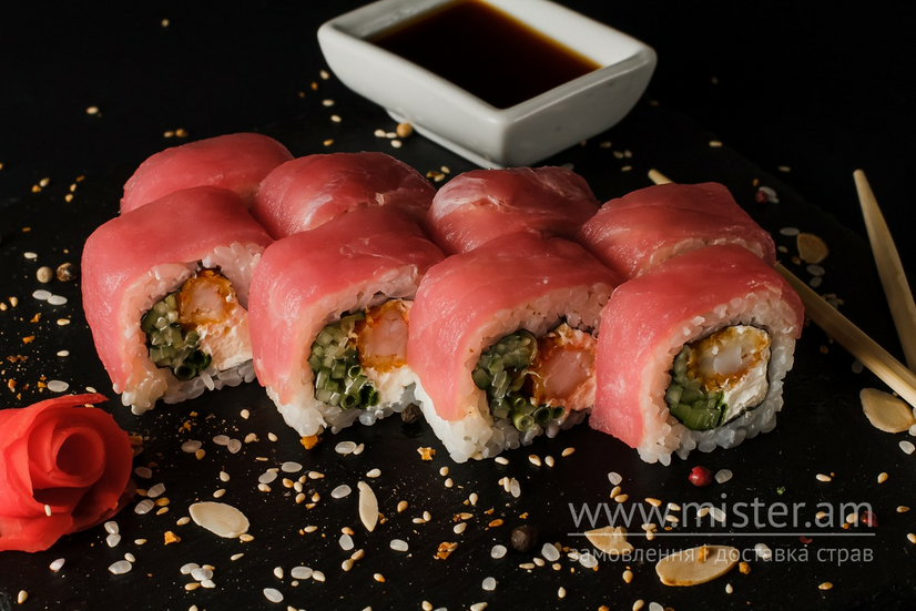 Рис, тунець, лосось, креветка, авокадо, зелена цибуля.