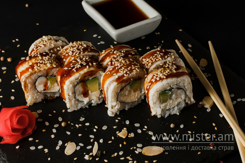 Рис, вугор, креветка, авокадо, сир вершковий.