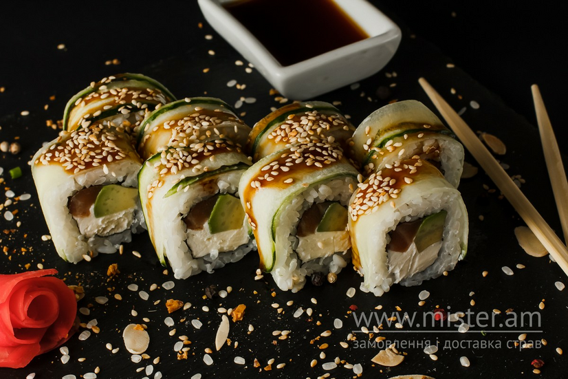 Рис, огірок, лосось, авокадо, сир вершковий, соус унагі, кунжут.