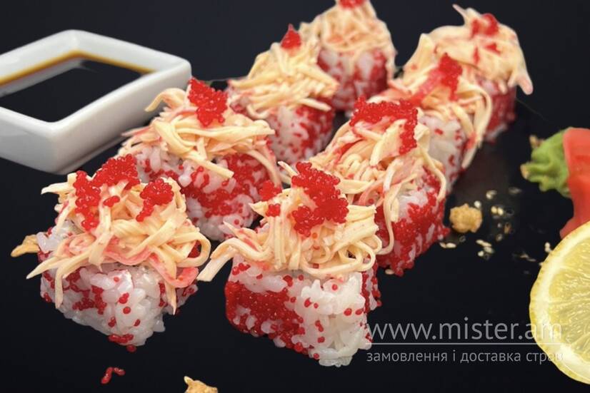 Рис, сир вершковий, сніжний краб, авокадо, ікра тобіко, соус спайсі.