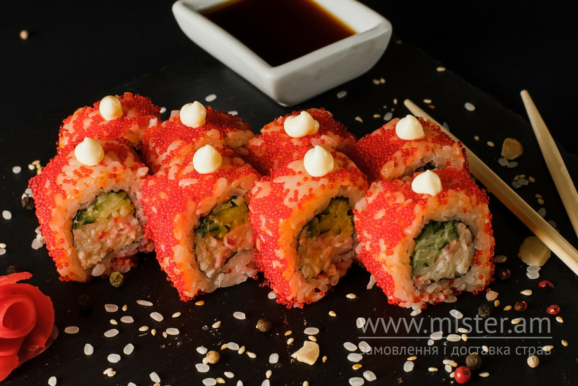 Рис, крабова паличка, огірок, ікра тобіко, майонез.