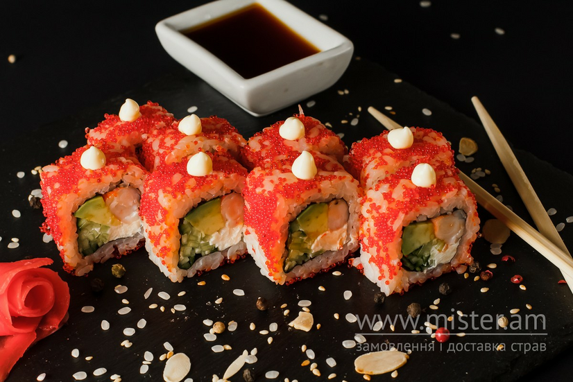 Рис, креветка, огірок, ікра тобіко, сир вершковий, майонез.