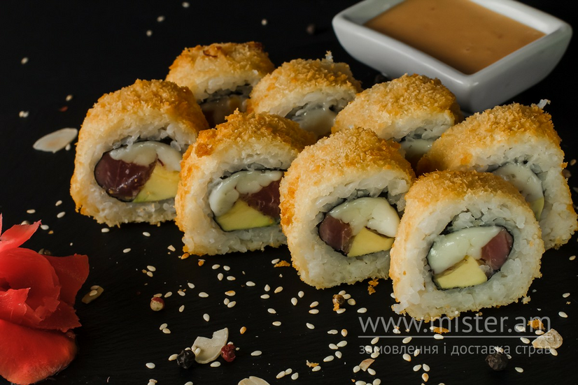 Рис, тунець, авокадо, моцарела, соус спайсі.
