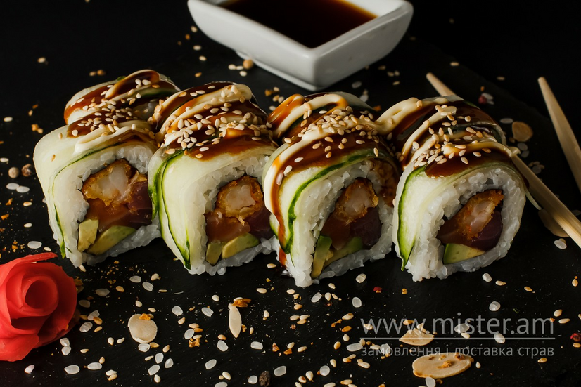 Рис, огірок, тунець, креветка, лосось, авокадо, зелена цибуля, соус спайс, соус унагі.