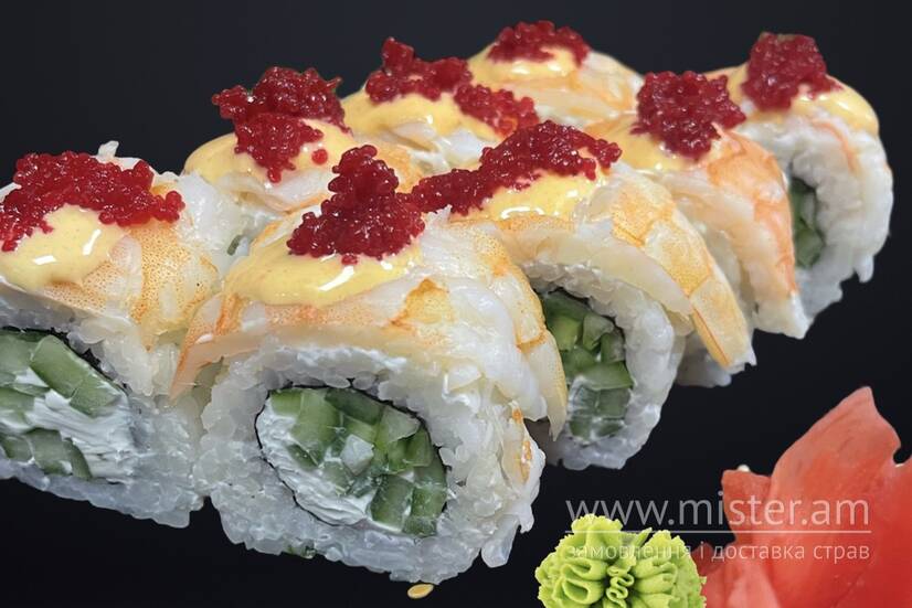 Тигрова креветка, рис, огірок, сир вершковий, соус спайсі, ікра тобіко.
