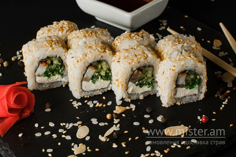 Рис, вугор, хіяши, огірок, сир вершковий, кунжут.