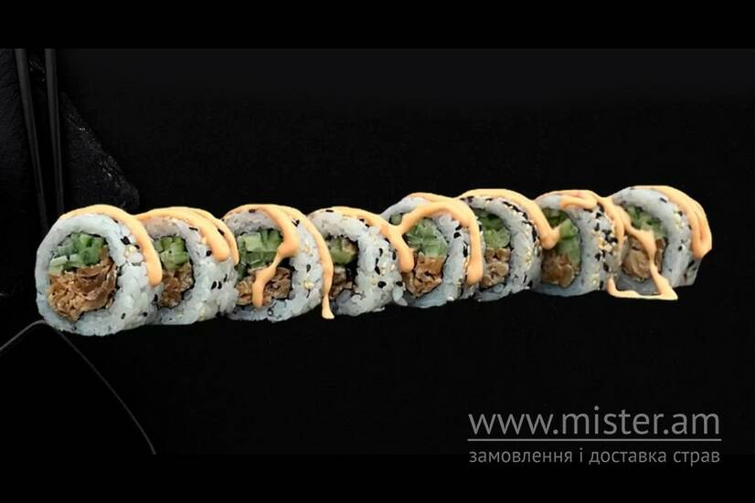 Рис, огірок, лосось смажений в спеціях та соєвому соусі, соус спайсі.