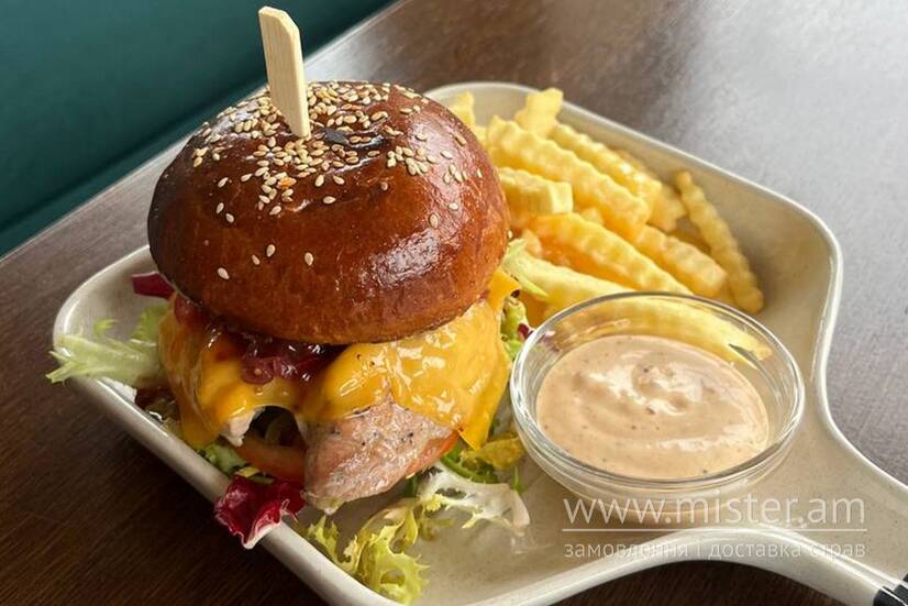 Ніжна булка бріош, куряче бедро, сир чеддер, бекон, перець халапеньйо, карамелізована цибуля, цибулевий кранч, помідор, соус з журавлини, соус BBQ.