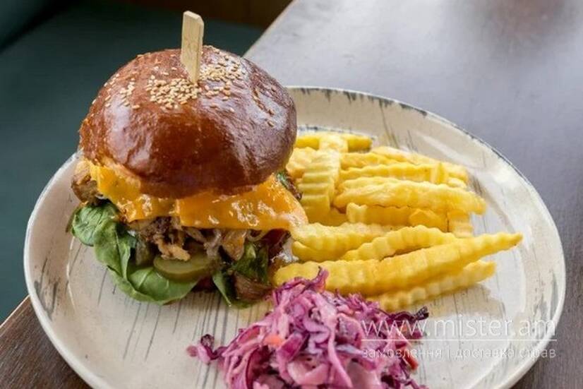 Ніжна булка бріош, рвана свинина, сир чеддер, квашений огірок, маринована цибуля, салат коул слоу, помідор, соус сирний, соус BBQ.