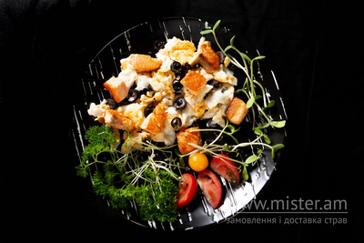 Яєчня-бовтунка, лосось, оливки, зелень.