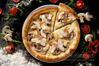 Соус вершковий, сир, шинка, моцарелла, шампіньйони, куряче філе.