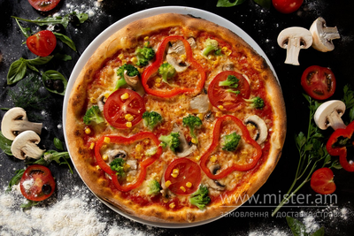 Соус томатний, шампіньйони, броколі, перець болгарський, помідори, кукурудза, сир.
