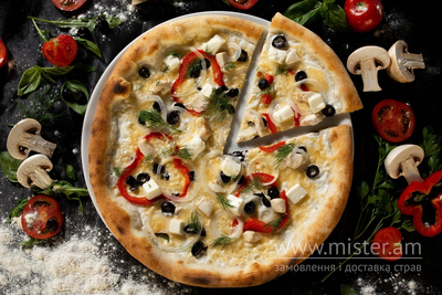 Соус вершковий, куряче філе, фета, оливки, перець, цибуля, зелень, сир.