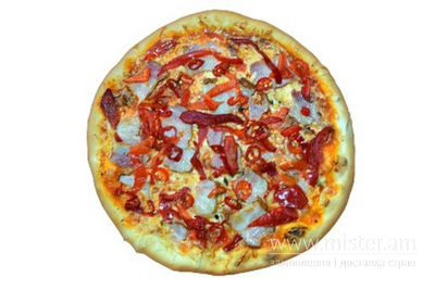 Соус томатний, сир, бекон, перець болгарський, чілі.