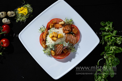Айсберг, помідор, грінки, лосось, пармезан, салатна заправка.