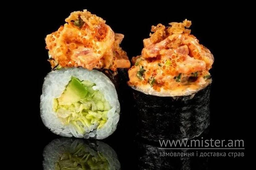 Суші-рис, норі, авокадо, айсберг, огірок, спайсі соус, цибуля зелена, цибуля кранч, ікра масаго, тунець.