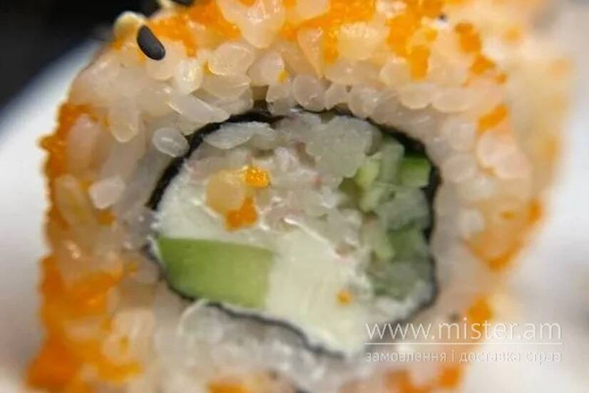 Суші-рис, норі, авокадо, огірок, сир вершкорвий, краб сніжний, ікра Масаго, кунжут.
