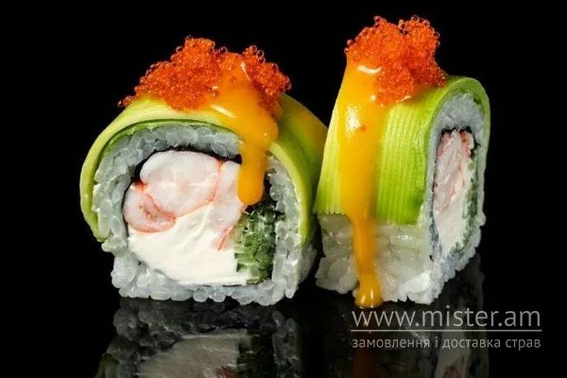 Суші-рис, норі, сир вершковий, креветка, огірок, авокадо, фісташки, манго соус, ікра Тобіко.