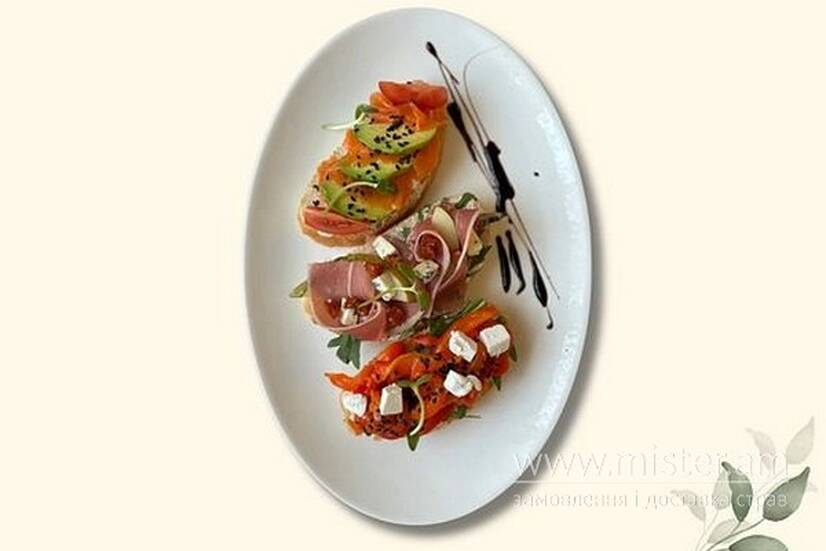 Брускета з лососем, брускета з прошуто, брускета з перцем.
