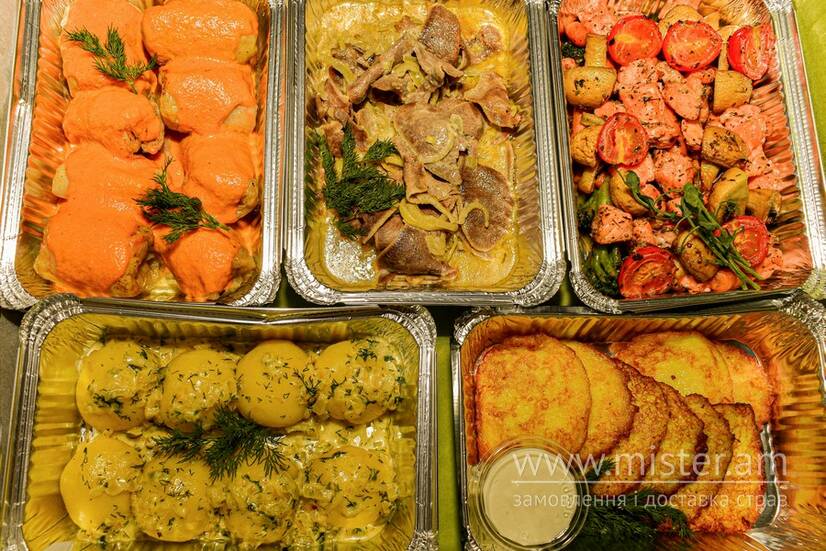 Книглі з сиром, деруни зі сметаною, голубці по-українськи. язик тушкований, соте з лососем. Рекомендовано на 3-4 особи.