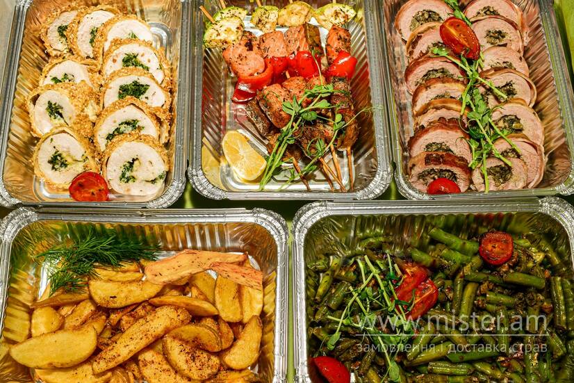 Крученик курячий зі шпинатом та сиром дор блю, свинний рулет з грибною ікрою та беконом, стручкова квасоля з грецьким горіхом, картопля запечена, шпажки з лососем та овочами. Рекомендовано на 3 особи.