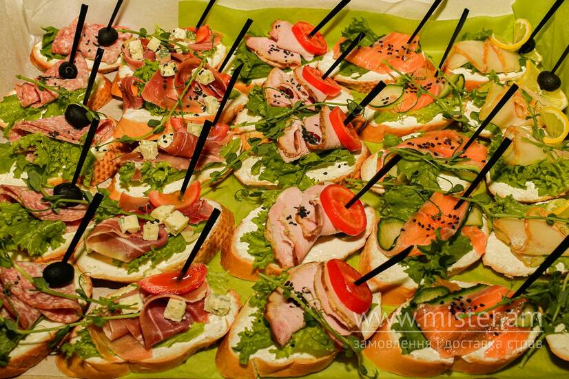 Канапе з шинкою - 5 шт., канапе з прошуто - 5 шт., канапе з салямі - 5 шт., канапе з лососем - 5 шт., канапе з масляною - 5 шт. Кількість: 25 шт. Рекомендовано на 4-5 осіб.