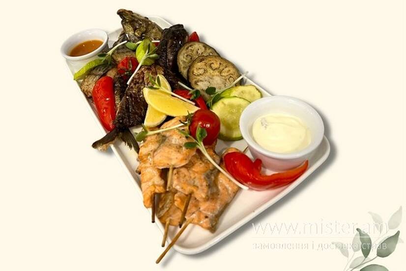 Короп гриль, скумбрія гриль, лосось гриль, овочі гриль, соус вершково-часниковий, соус манго-чилі.