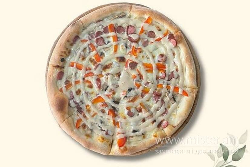 Ковбаски єгерські, моцарела, печериці, перець болгарський, соус Цезар, вершкова основа.