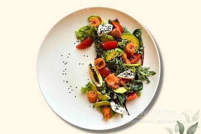 Лосось слабосолений, крем-сир, мікс салатів, авокадо, помідори, соус кунжутний.
