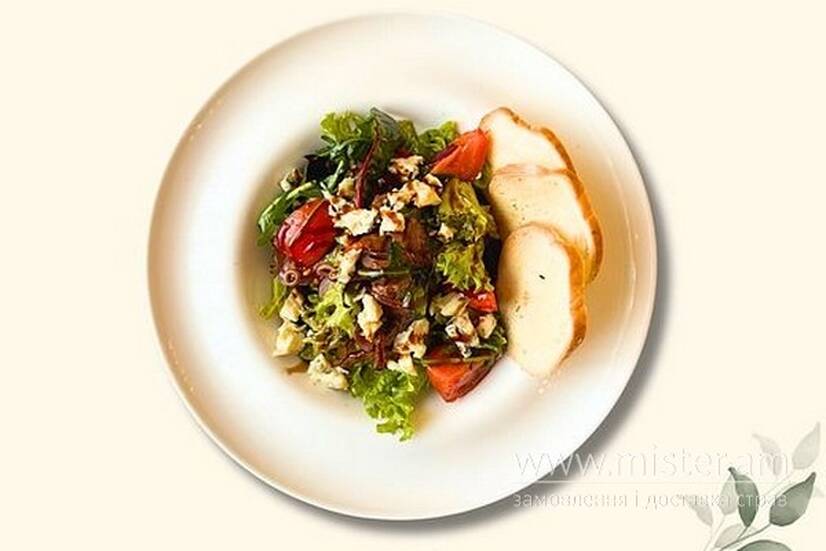 Яловича вирізка, мікс салатів, помідори чері, цибуля синя, дорблю, багет, соус Унагі.