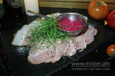 Грудинка, шинка, ковбаса рублена домашня копчена, соус хрін.