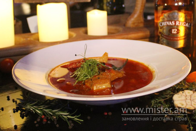 Картопля, помідор, часник, морква, цибуля, корінь селери, перець болгарський, копчені ребра, телятина.
