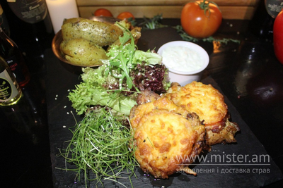 Свинина, бекон, сир, картопля, помідор, салат зелений.