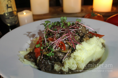 Телятина, картопляне пюре, печериці, цибуля, кунжут, соус.