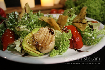 креветки, листя салату, помідори, перепелине яйце, грінки, пармезан, соус