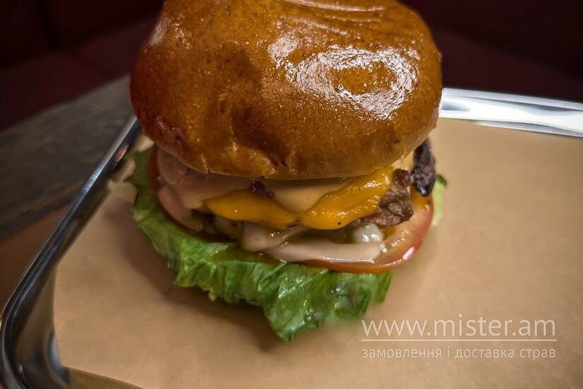 Соковита яловича котлета, натуральна Моцарела, сир Чеддер, айсберг, кармелізована цибуля, огірки мариновані, помідори, булочка Бріош, Часниковий та Празький соуси.