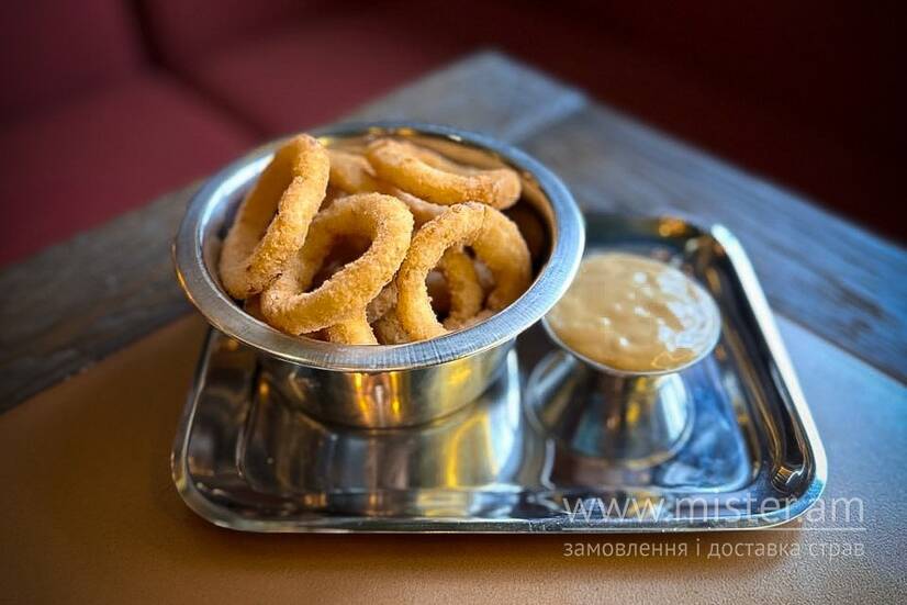 Цибулеві кільця з соусом на вибір (рекомендуємо соус Каскад).