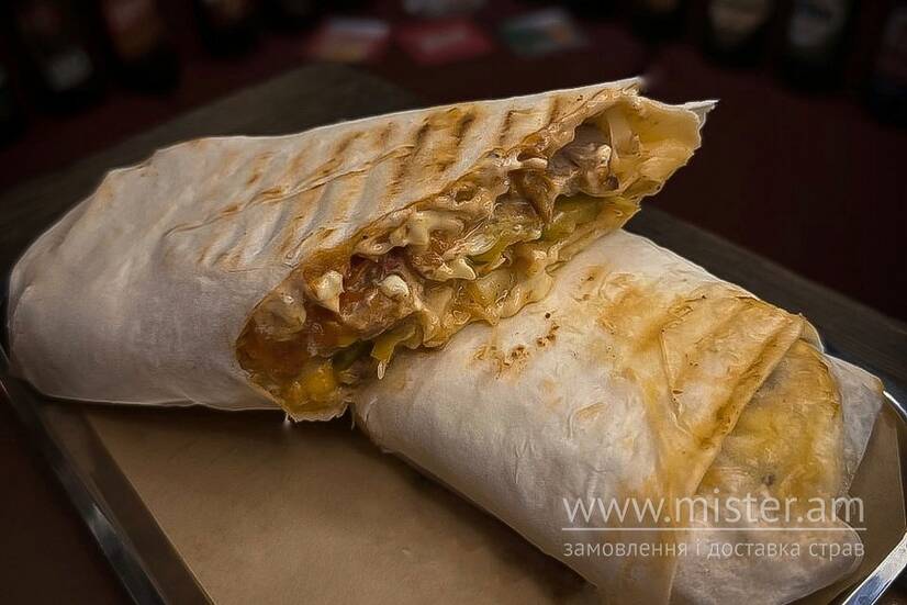 Вірменський лаваш, ніжна маринована курочка, смажений бекон, салат Коу Слоу, помідори, мариновані огірки, кукурудза, натуральна Моцарела, соуси Празький та Чеський.