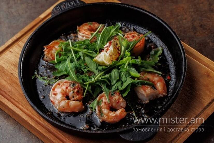 Запечені королівські креветки під гострим маринадом із часником, пластівцями чилі, соєвим соусом та солодкою паприкою, посипані руколою та политі бальзамічним оцетом.