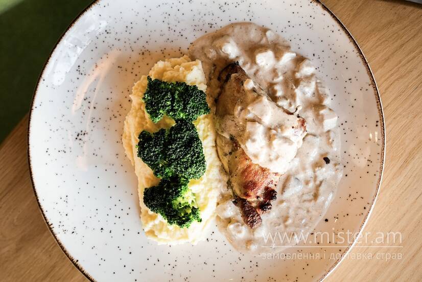 У соусі з білими грибами та картопляним пюре.