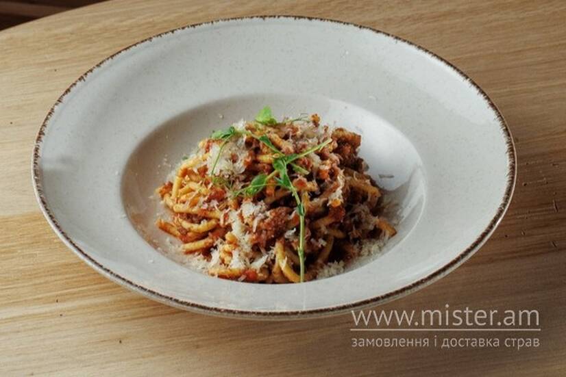 Спагеті власного виробництва, з яловичим фаршем, червоним вином, базиліком та розмарином.