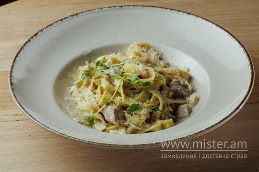 Тальятеле власного виробництва, з тушкованою свининою, під соусом з білих грибів та пармезаном.