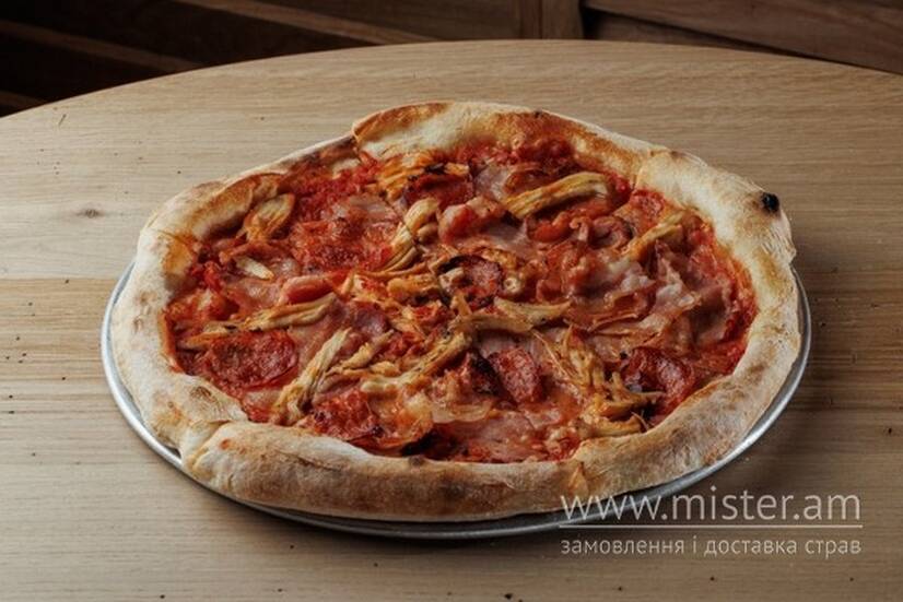 Соус пелаті, моцарела, мортадела, панчета, куряче філе, салямі піканте.