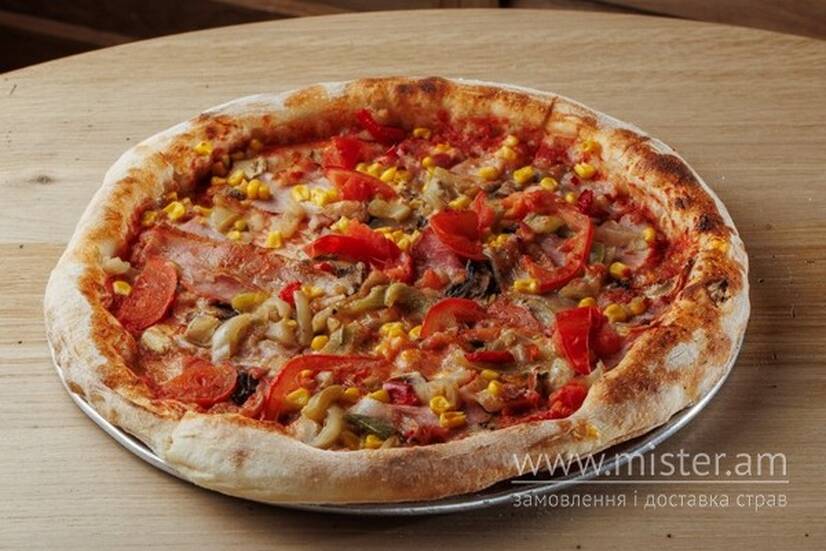 Мортадела, панчета, кукурудза, печериці, помідори, болгарський перець, моцарела, соус пелаті.
