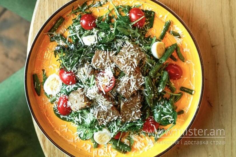 Мікс салату, помідори чері, яйця перепілки, сир пармезан, телятина, квасоля стручкова.