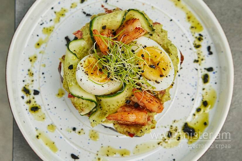 Найніжніше гуакамоле на бріош-тості з кремом з фети, свіжим огірком, тигровими креветками, яйцем на м‘яко та крашем з чорних оливок.