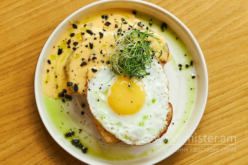 Сендвіч із булочок бріош з курячим філе, сиром чедер, беконом, окатим яйцем під соусом голандез.